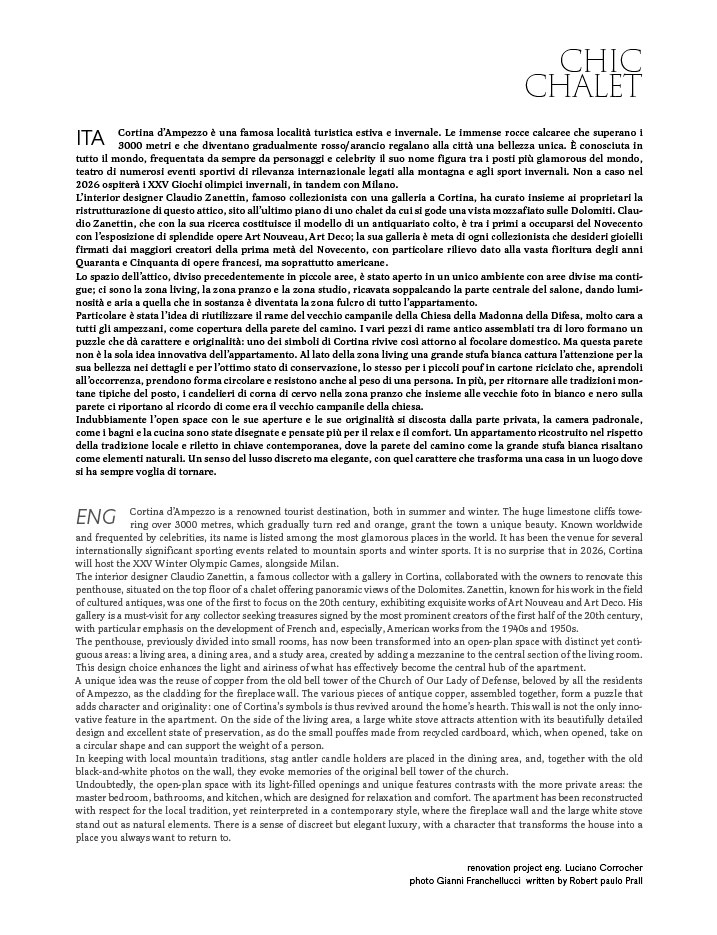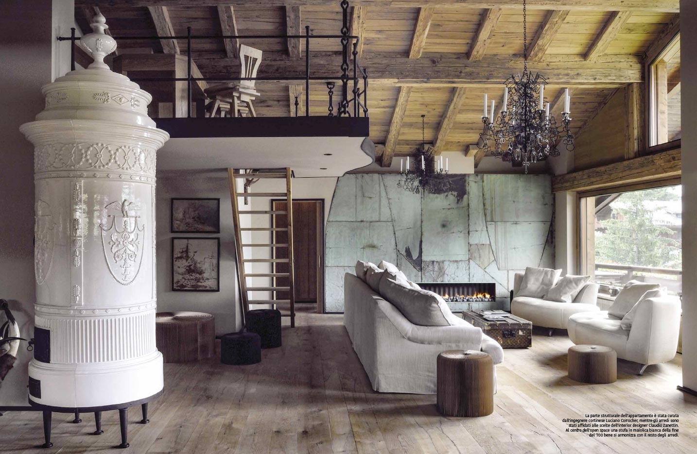 La parte strutturale dell'appartamento è stata curata dall'ingegnere cortinese Luciano Corrocher, mentre gli arredi sono stati affidati alle scelte dell'interior designer Claudio Zanettin. Al centro dell'open space una stufa in maiolica bianca della fine del '700 bene si armonizza con il resto degli arredi.