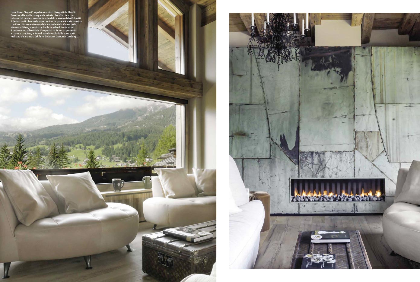 I due divani "Fagioli" in pelle sono stati disegnati da Claudio Zanettin; alle spalle una grande vetrata che affaccia su un balcone dal quale si ammira lo splendido scenario delle Dolomiti. Particolare della zona camino: la parete è stata rivestita con il vecchio rame rimosso dal campanile della Chiesa della Madonna Difesa, al centro un baule in pelle di Louis Vitton è usato come coffee table. I lampadari in ferro con pendenti a cuore, a bandiera, a ferro di cavallo e a farfalla sono stati realizzati dal maestro del ferro di Cortina Giancarlo Candeago.