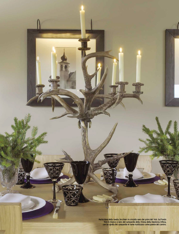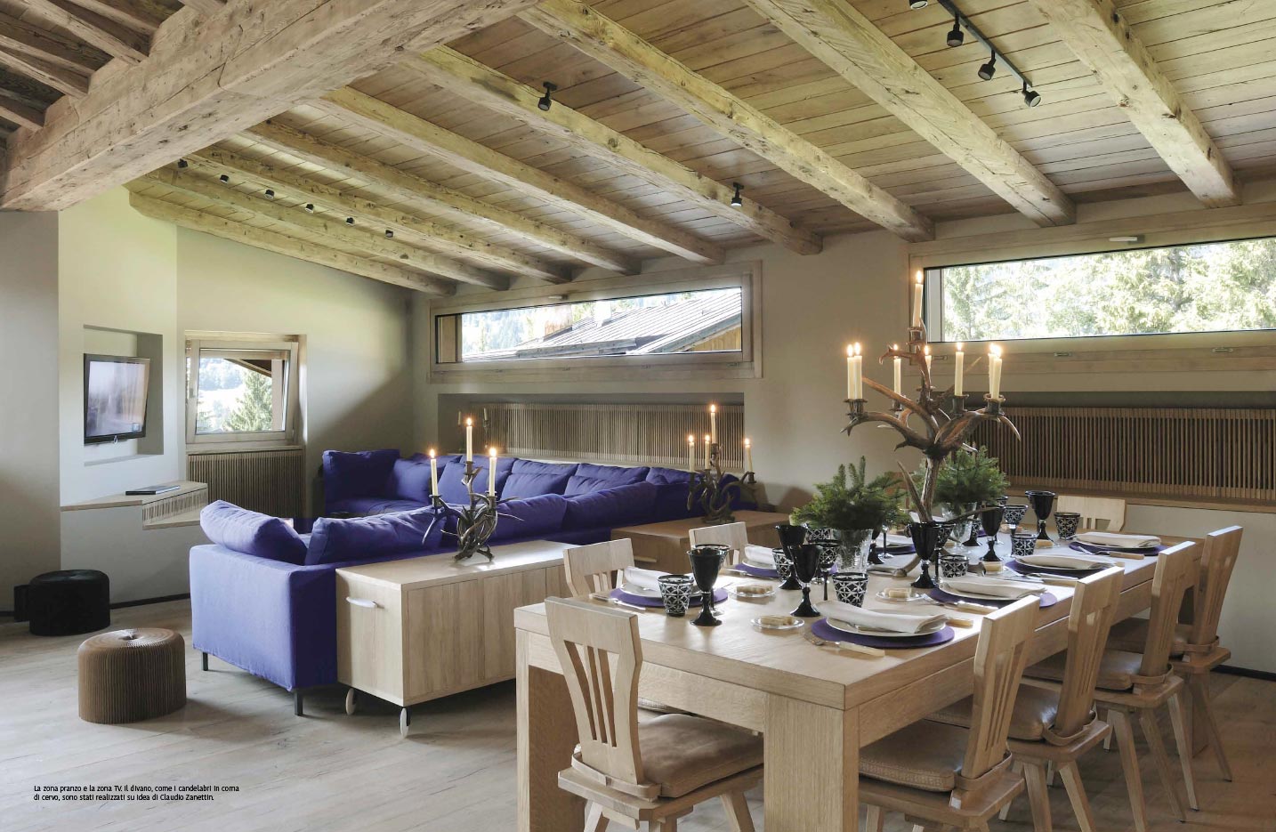La zona pranzo e la zona TV. Il divano, come i candelabri in corna di cervo, sono stati realizzati su idea di Claudio Zanettin.