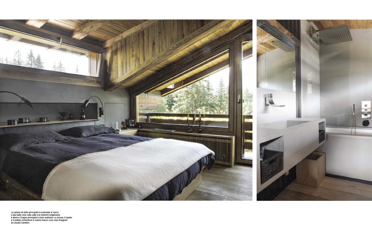 La camera da letto principale è essenziale al riposo e alla bella vista sulla valle e le Dolomiti Ampezzane. Il bagno principale è stato realizzato su misura; il lavabo e il mobile contenitore in marmo bianco sono stati disegnati da Claudio Zanettin.