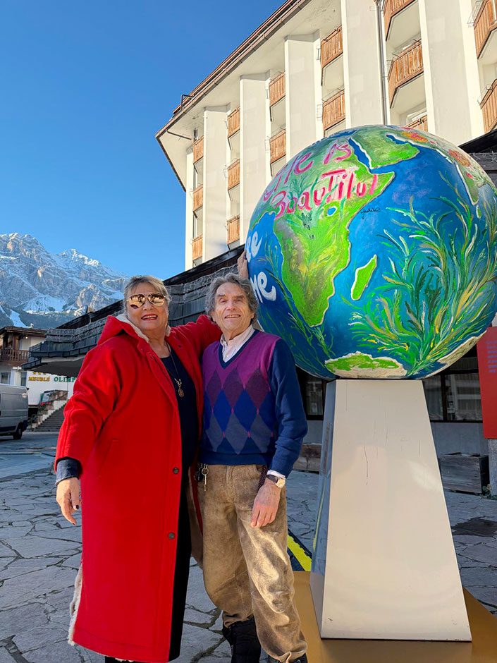 Martina Mondadori con Claudio Zanettin nel suo negozio "La Ruotellina è Claudio Zanettin" a Cortina d'Ampezzo