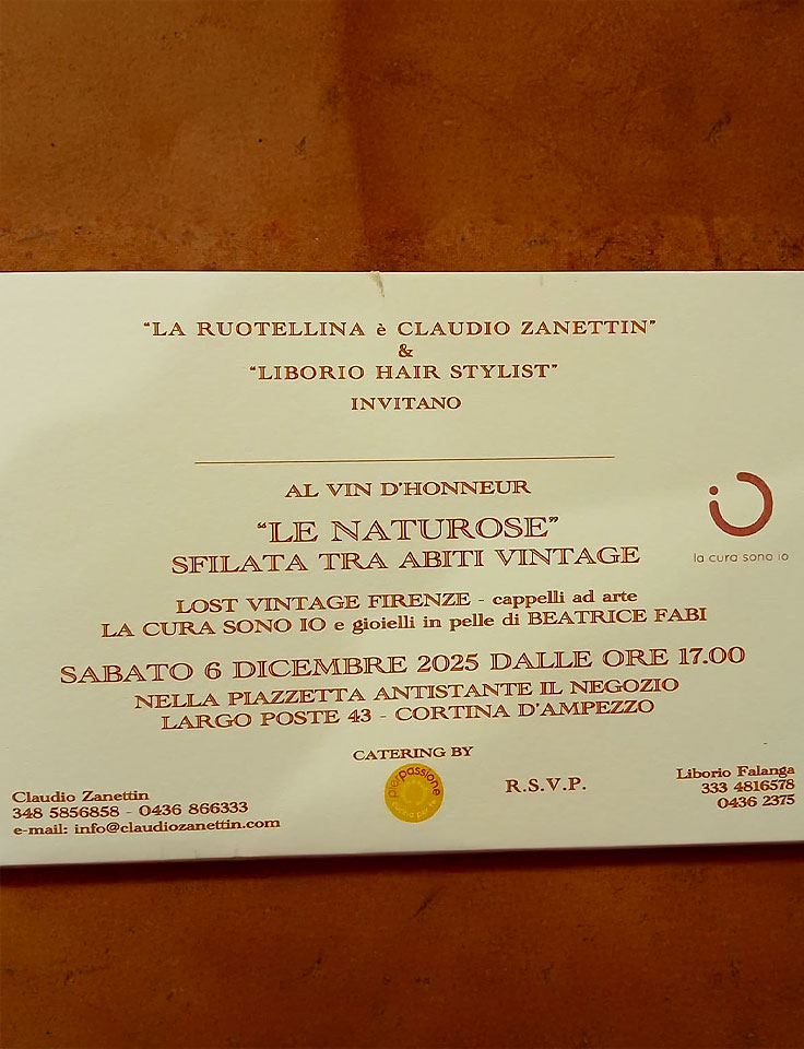 Sabato 6 dicembre 2025 nella piazzetta antistante il negozio "La Ruotellina è Claudio Zanettin" evento LOST VINTAGE FIRENZE - cappelli ad arte LA CURA SONO IO e gioielli in pelle di Beatrice Fabi.