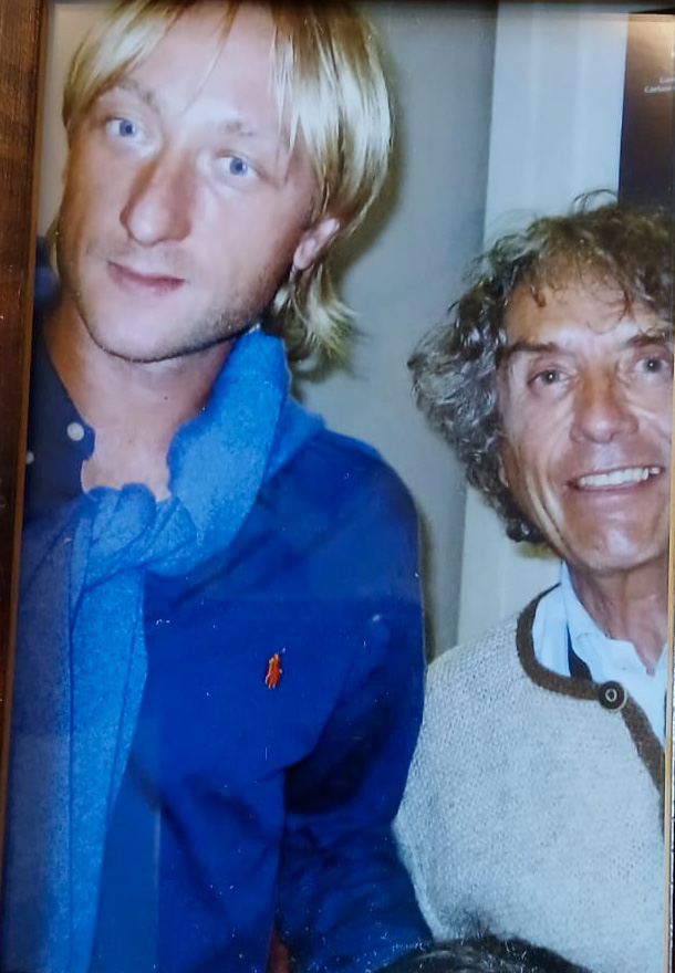 Evgenij Pljuščenko, vincitore di tre titoli mondiali (2001, 2003, 2004) e sette titoli europei (2000-03, 2005-06, 2010, 2012) di pattinaggio artistico, con Claudio Zanettin allo stadio del ghiaccio di cortina il 18 AGOSTO 2012.