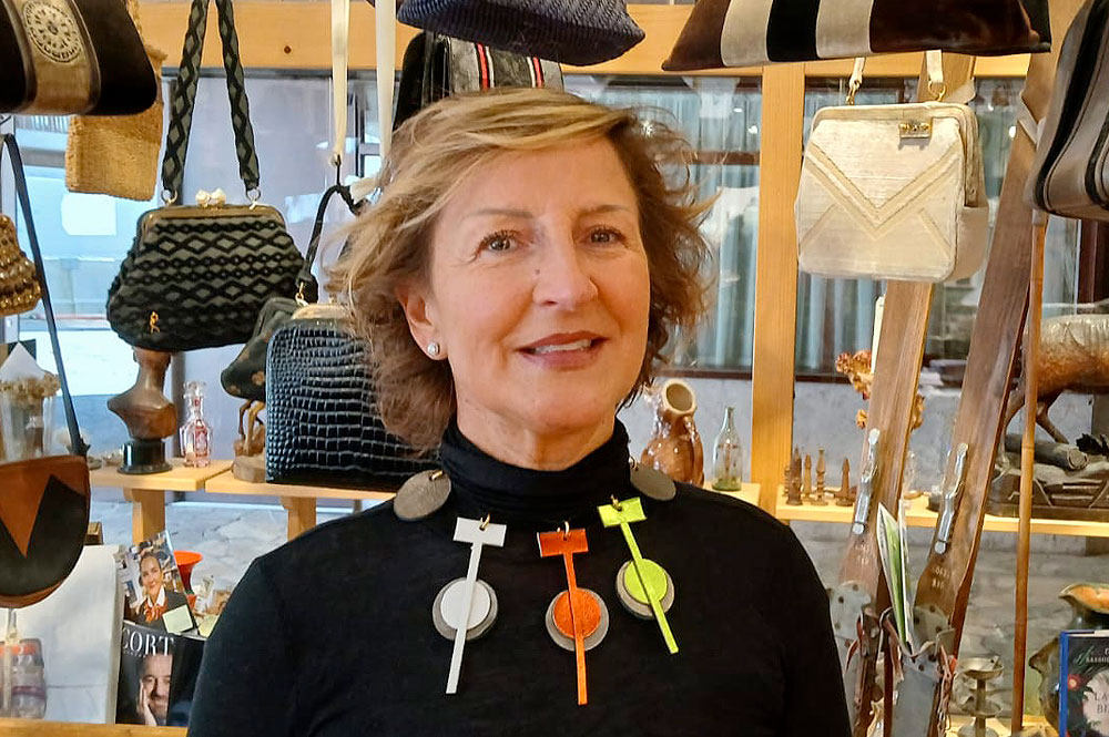 Roberta Lorenzi "CHENOPA" moglie del Sig. Sindaco di Cortina Gianluca Lorenzi "CHENOPO" indossa il collier "curling" in pelle eseguito da Beatrice Fabi ed ideato da Claudio Zanettin, come simbolo Olimpico 2026, avuto in regalo simbolico da Claudio Zanettin.