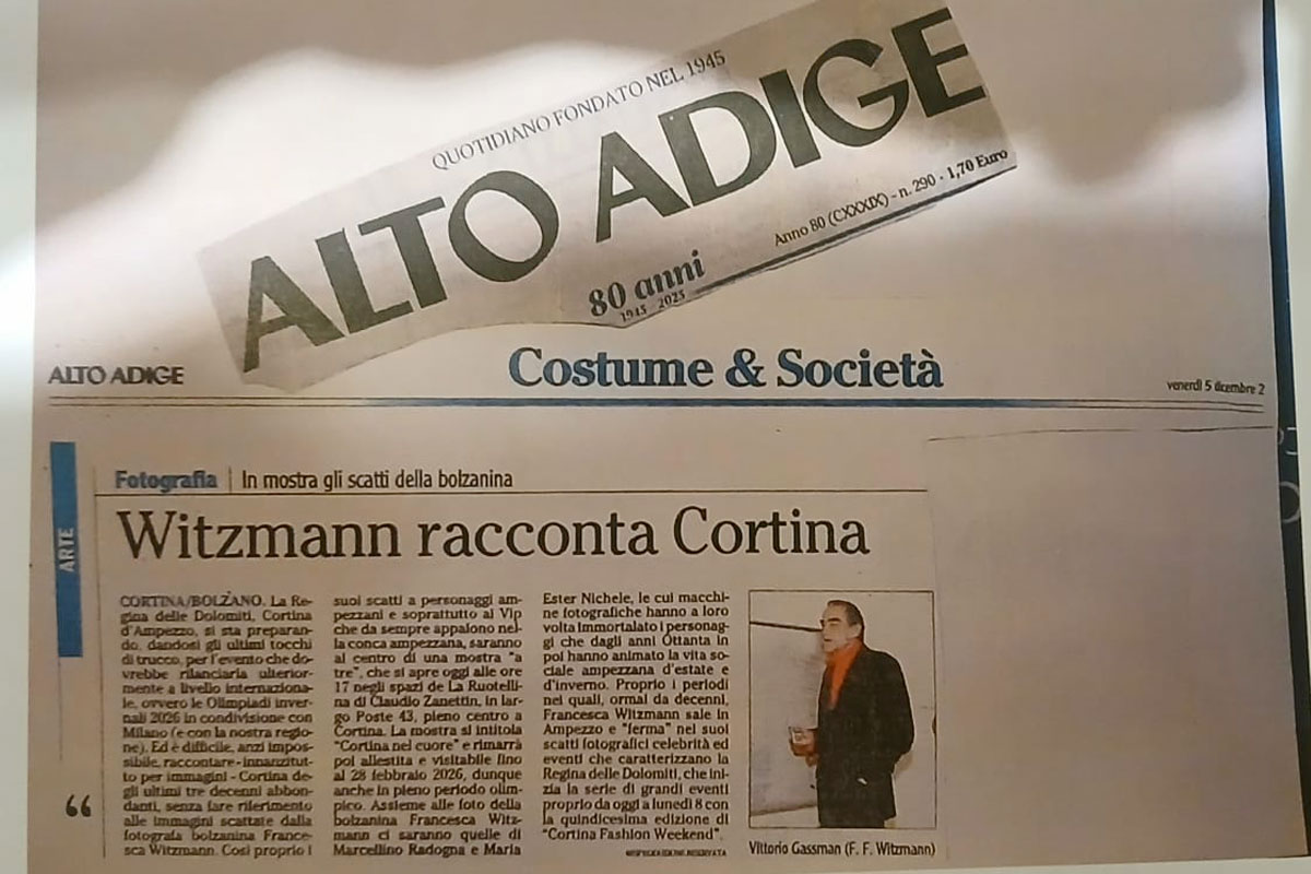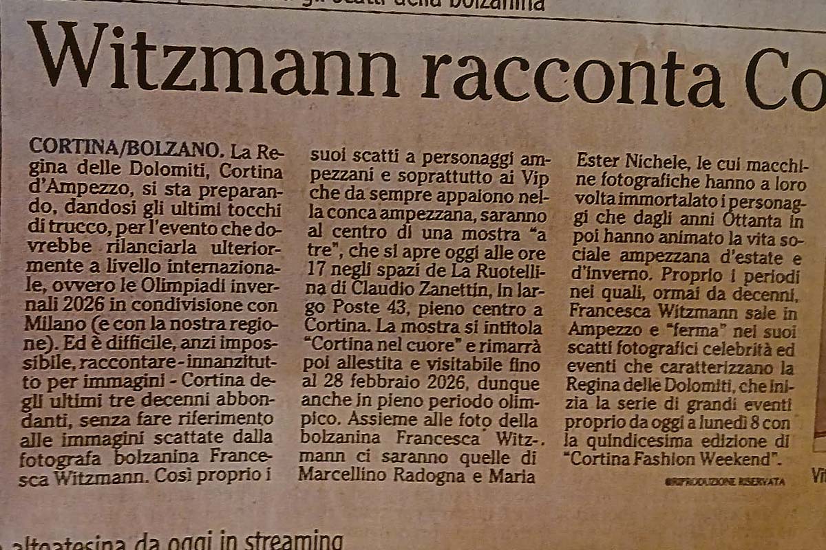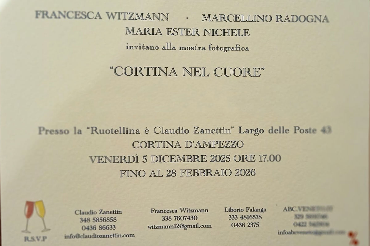 Mostra "a tre" che si è aperta venerdì 5 dicembre negli spazi de "La Ruotellina è Claudio Zanettin" e sarà allestita e visitabile fino al 28 febbraio 2026, in pieno periodo olimpico. Troverete esposti gli scatti della fotografa bolzanina Francesca Witzmann, di Marcellino Radogna e Maria Ester Nichele.