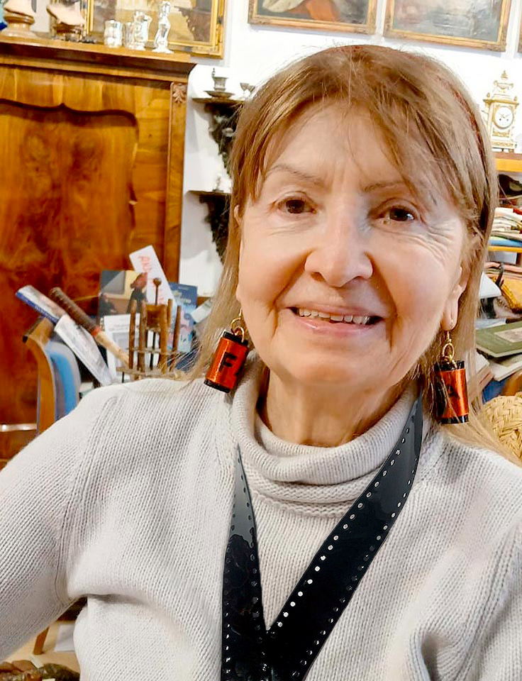 Franca Giuliani Ricci con una parure composta da collier e orecchini in pelle color corallo realizzati da Beatrice Fabi, ideati da Claudio Zanettin.