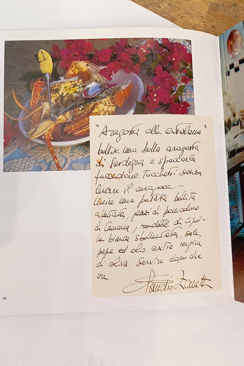 Le pareti bianche, che riflettono il forte riverbero della luce e fanno da sfondo a oggetti ispirati al mare, creano un ambiente che ricorda l’interno di uno yacht. Sui tavolini così come nella credenza in legno di iroko spiccano oggetti insoliti, come la tabacchiera tedesca di fine Seicento, ricavata dalla chela di un granchio gigante, il puntale di un pesce sega inserito in una base del Settecento, due denti di capodoglio o un ramo a forma di corallo realizzato in pasta vitrea negli anni Trenta, che si accompagnano armoniosamente a pezzi di fattura cinese e giapponese.
